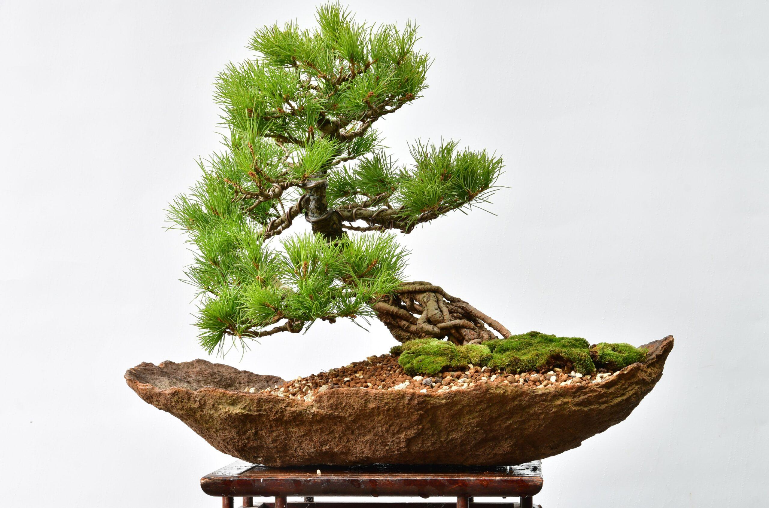 Dieser Baum mit geflochtenem Wurzelansatz bekommt in dieser aus Japan importierten Landschafsschale eine besondere Note und wird jeden Bonsai Sammler begeistern